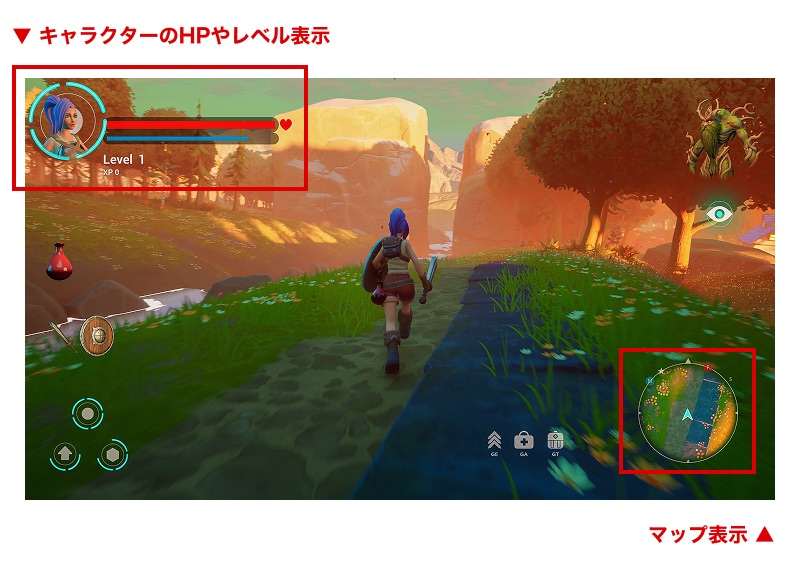 HUDはステータス画面等、画面を切り替えなくても、キャラクターを操作しながら必要な情報が得られる事が特徴です。