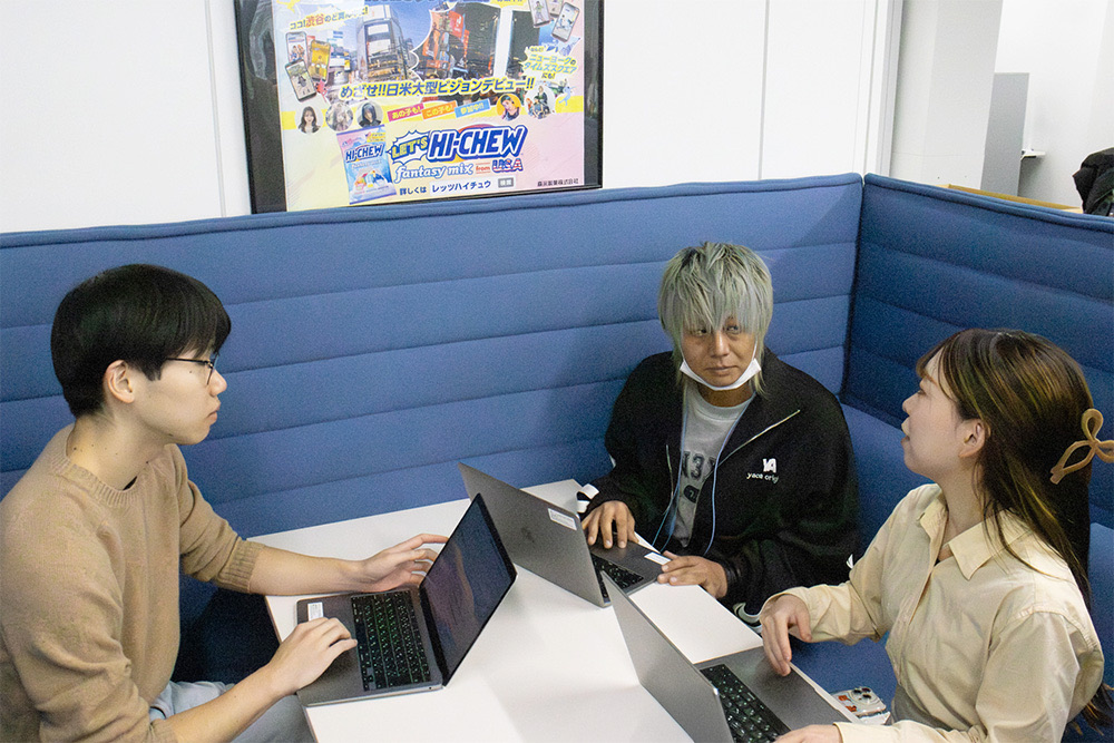 ▲ 左側の男性社員の方は、もともと飲食店の接客担当をしながらクリエイター活動をしていた。「入社するとクリエイターが身近にたくさんいるのですぐ成長できた」とのこと