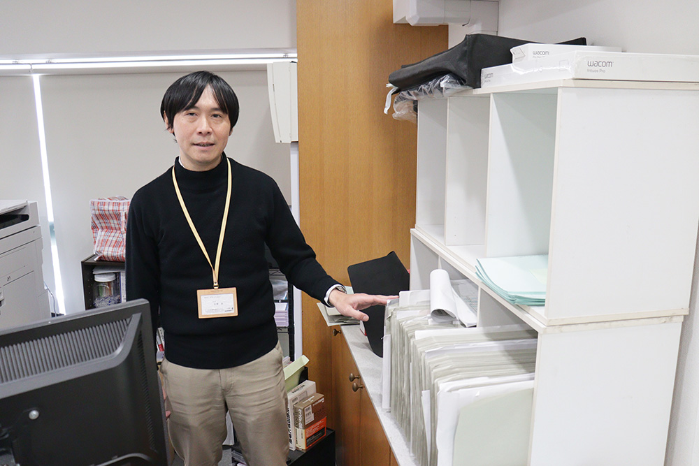▲ アニメーターさんが一枚ずつ描いた原画が詰まった「カット袋」がぎっしり詰まった棚。アニメづくりという仕事の重みが改めて感じられる