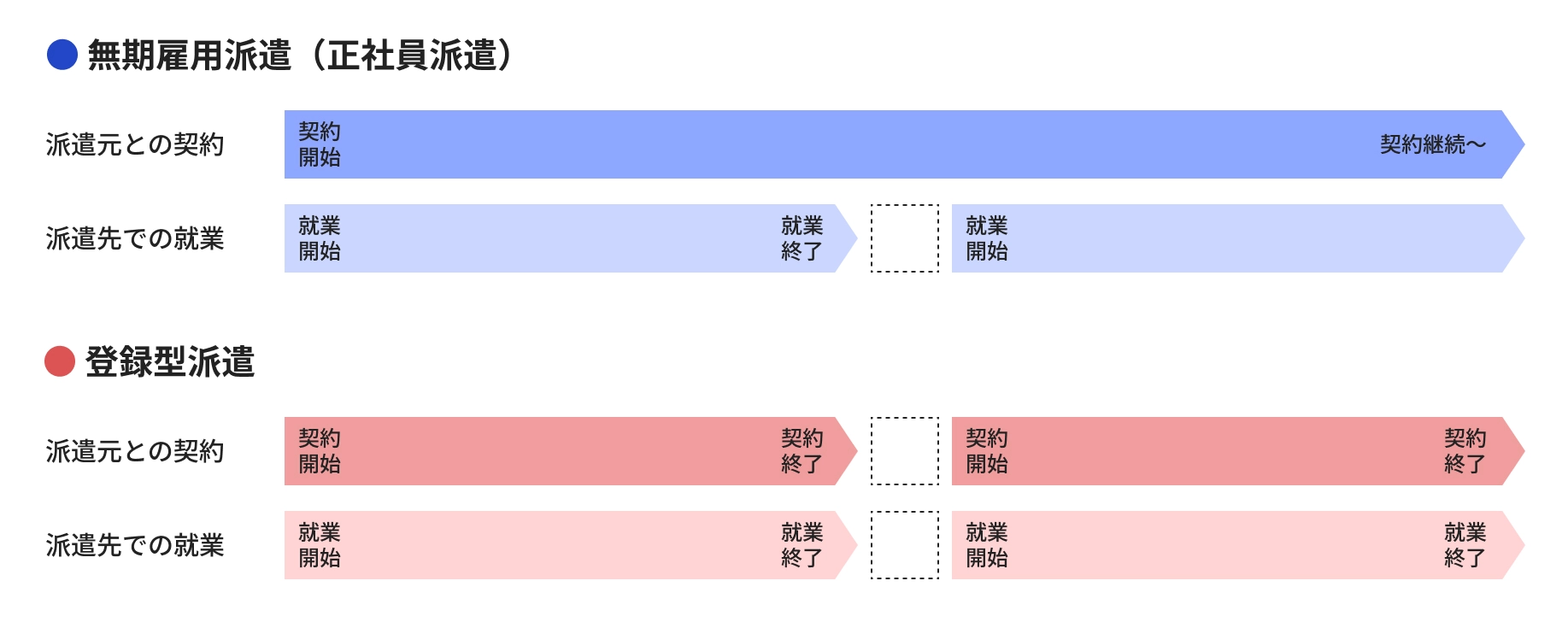 「登録型派遣」は派遣先企業での契約が終了するとともに派遣元との労働契約も満了となりますが、「無期雇用派遣」は派遣先での就業期間終了後でも派遣元との雇用関係は継続されるという特徴があります。